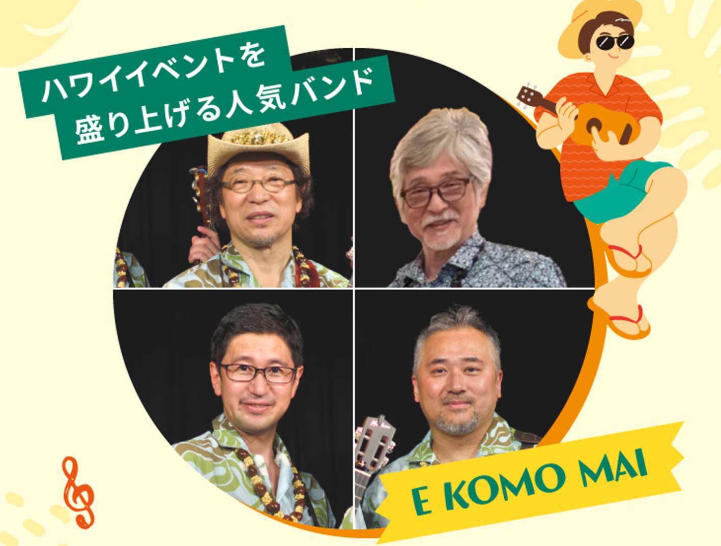 「E KOMO MAI」とは英語で「Welcome」、日本語で「いらっしゃ~い」と言う意味のハワイ語。ハワイアンとオリジナルをほどよくミックスした「エコモマイ」は、ハワイアンの楽しさを伝えるだけでなく、様々な音楽要素を取り入れたファンキーなサウンドと、ロックスピリットあふれるステージが話題になっている。